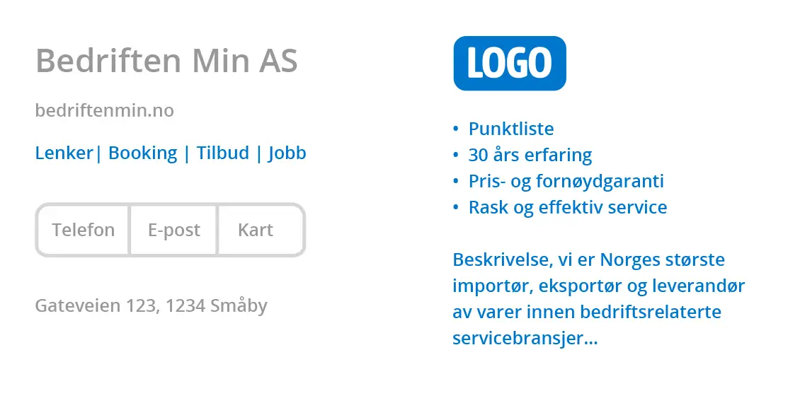 Legg til fire ekstra lenker til din bedrifts viktigste nettsider for eksempel tjenester, ledige stillinger, kampanjer etc.